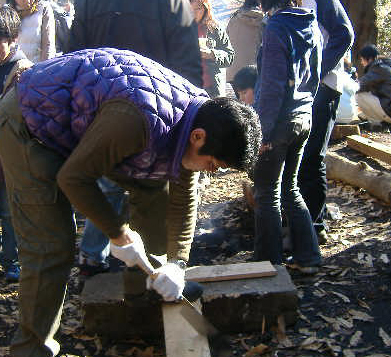 で廃材置き場から木材を持ち出し、のこぎりで細かく切り、新
